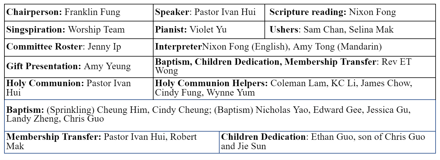 Deacon Election: Election for a new term of deacons will be held in our AGM this year. According to the church rule book, 8 deacons will be elected. Invitation letters were sent to all the members who meets the requriements for deacon election from the deacon nomination committee, and the following members have accepted the invitation:
